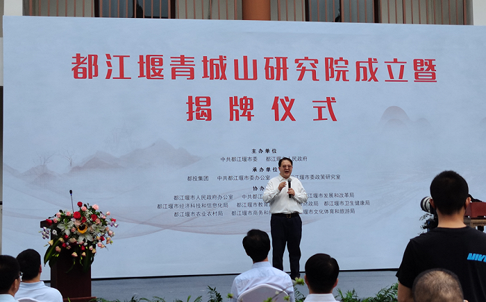 在成立暨揭牌仪式上,蒋蔚炜发表了热情洋溢、真挚诚恳的致辞,他从“智”“库”“果”三个方面进行了交流。“智”,按照建设现代化、国际化智库的要求,学习2200多年前李冰治水的大智慧,融会贯通天文、地理、化学等多学科、多领域,修建伟大工程,泽被后世、润泽天府。“库”,都江堰是一个宝库,不仅有世界著名的文化旅游遗产地,也有南怀瑾、张大千、徐悲鸿、孙思邈、花蕊夫人等各行各界的翘楚和名人。我们要挖掘好、传承好、弘扬好都江堰历史人文的宝库。“果”,希望研究院能够结合党中央国务院和省委省政府、市委市政府的要求,更加聚焦都江堰的实际需要,特别是围绕着产业建圈强链、做优做强郊区新城功能,智慧都江堰建设等方向,结出更多高质量的成果。