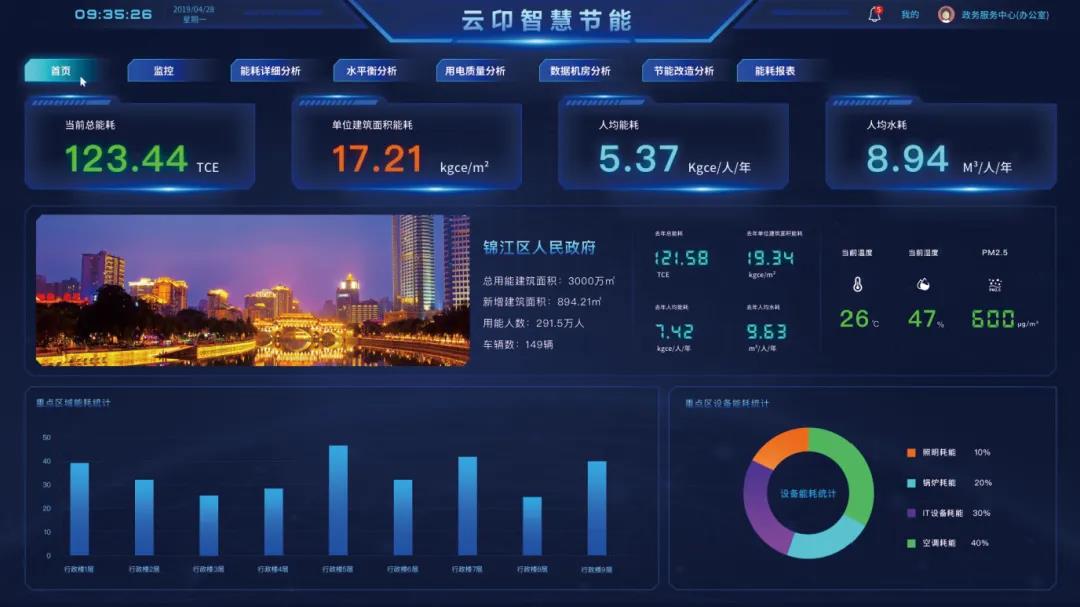 云卬智慧节能云管控平台通过对空调、电梯、照明、数据机房等各类用能设备进行综合能耗监测,云平台可将节能改造前后的各项真实能耗数据进行对比,通过统计、分析、预警等,将用能数据报告传送到客户终端,展示建筑实时用能情况和改造后的节能量。
