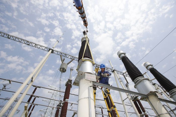 8月10日,在四川绵阳,国网绵阳供电公司变电检修人员冒着38摄氏度高温在220千伏丰谷变电站220千伏场地265开关间隔更换电流互感器。(田海 摄)