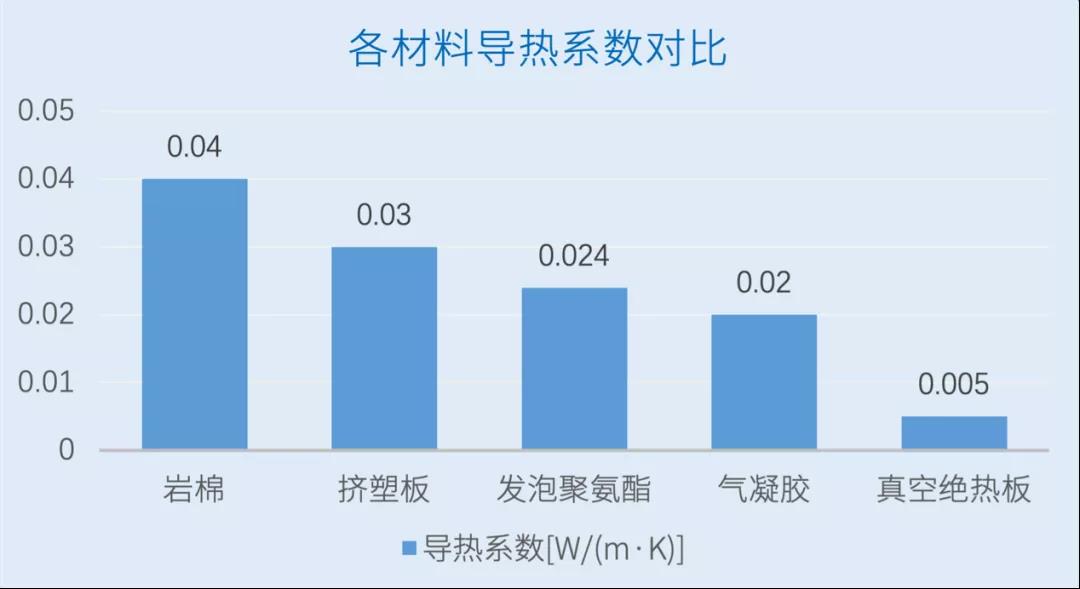 真空绝热板拥有极强的保温性能,其导热系数可低至0.005W/(m.K)以下,保温能力可达传统保温材料的5~8倍,甚至比价格高昂的气凝胶材料还要好4倍。
