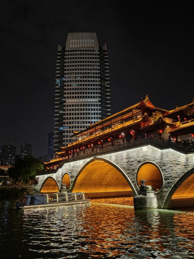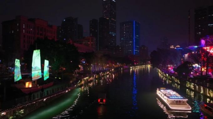 乘坐一艘古色古香的乌篷船自东门码头出发,途经“中国爱情地标”合江亭、雕梁画栋的安顺廊桥……锦江游船依托锦江两岸的建筑立面透明屏、叠水景观屏、堤岸投影,打造了科技感十足的多维空间场景秀,以河堤为画布,配合跌宕起伏的音乐效果和婀娜多姿的汉服表演,千年成都的河道文化仿佛书画长卷般跃然眼前。
