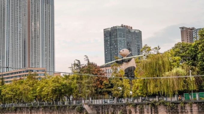 在新开放的活水公园码头,市民和游客游园、品茶,体验全新艺术装置“成都平衡”——一只横跨锦江,在空中走“钢索”的大熊猫。