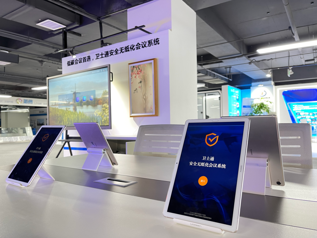 卫士通“无纸化会议系统”将会议所需使用的文件,转化为电子文档的形式,将评审材料全部上传至局域网服务器,并下载部署至平板电脑使用终端,省去了打印纸质材料的费用,避免了纸质打印造成的大量碳排放。
