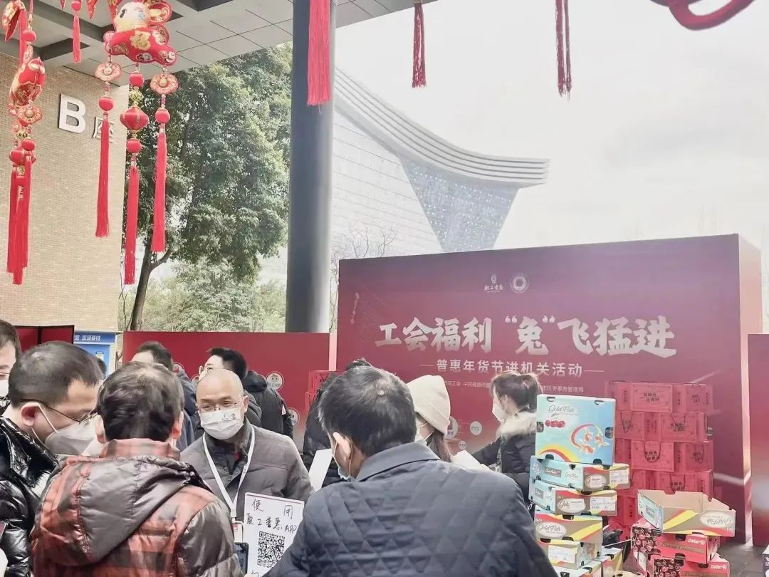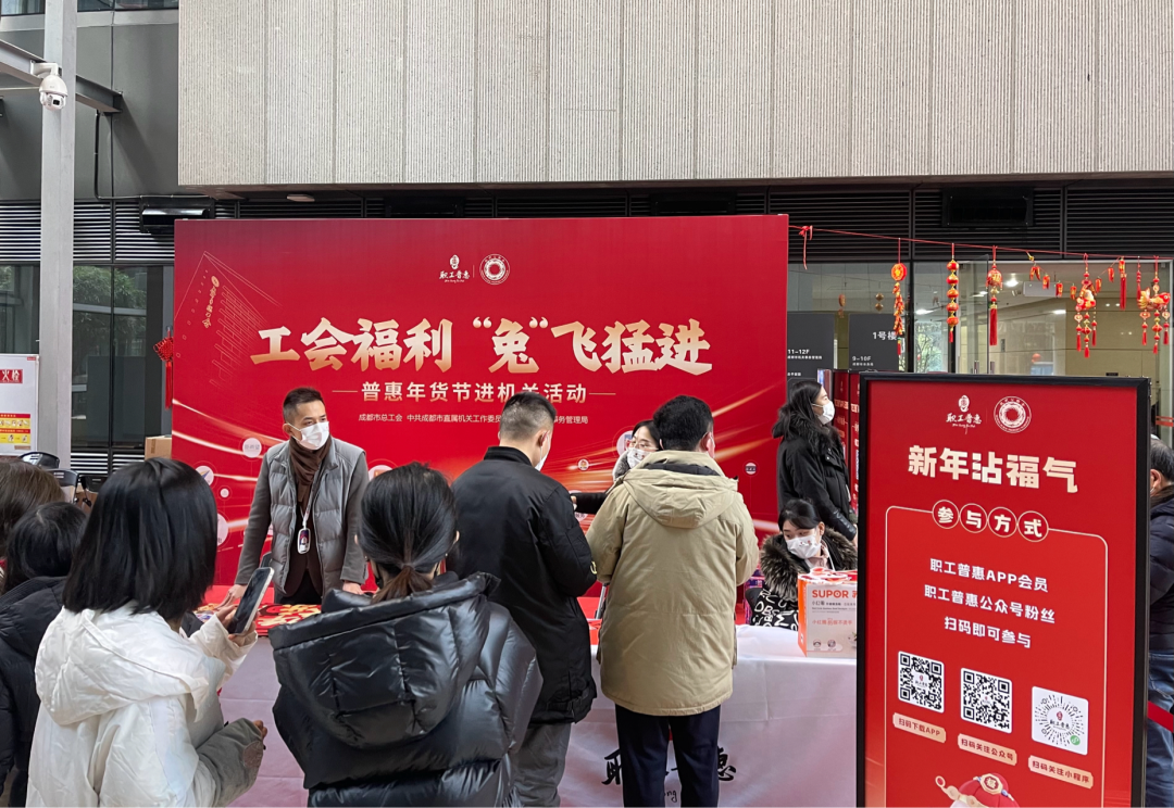 瑞虎辞岁去,玉兔迎春来。2023年1月16日至1月18日,成都市总工会联合中共成都市直属机关工作委员会、成都市机关事务管理局,在成都市市级机关第一、第二、第四集中办公区连续3天开展“普惠年货节进机关活动”。“现代公物仓”主动融入、积极参与,与“职工普惠”整合资源、合作共赢,携手向广大干部职工送出新年祝福。