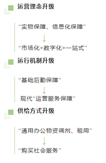 2017年成都市市级机关公物仓的第一次升级,是由“实体”转为“虚拟”,重点解决库管成本大、供需对称弱、服务品质低等问题;2021年至今的再次升级,则是由“虚拟”转为“现代”,意在突破服务类别少、购买程序繁、动态监管弱等难题,以服务方式转型带动服务保障品质提升。