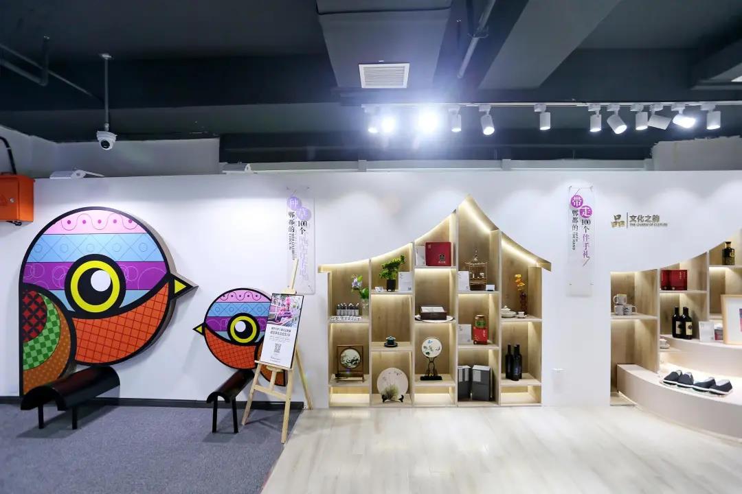现代公物仓郫都区展厅引入唐昌布鞋、安龙小微盆景、蜀绣、鸟笼等文化产品等特色产业,推荐销售郫县豆瓣系列调味品、蜀绣战旗“福”文化系列特色产品。郫都特色尽数展现。