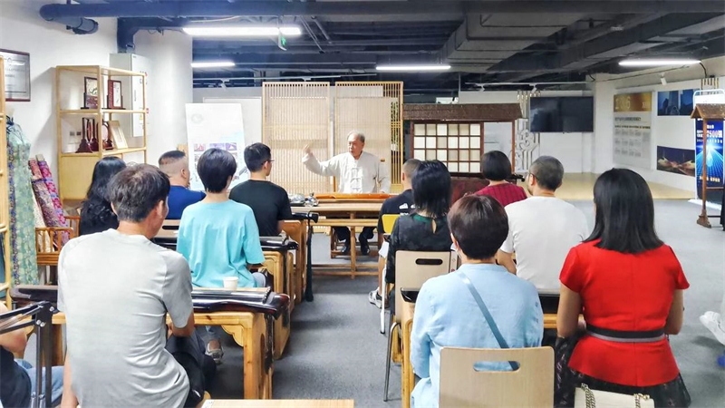 这里是“非遗公益课堂”展位,只要您感兴趣,也可以坐下来学习体验古琴等非遗技艺。9月14日的首节古琴公益课,吸引了不少市民前来参加。在1个半小时的课程里,古琴非遗传承人海溢老师围绕“何为古琴的最高境界““达到最高境界的途径”两个主题,带领大家进入“古琴研习”的美妙世界。