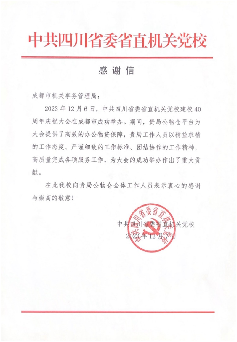 “低碳”会议是节约型机关建设的重要举措。本次大会筹备响应“低碳”要求,全部办公家具、绿植都是通过租赁方式完成保障,在降低办会成本的同时,也让闲置设施设备“流动”起来,有效促进资源利用,避免重复购置浪费。现代公物仓以高效节约的服务保障赢得了中共四川省委省直机关党校的认可,收到感谢信。