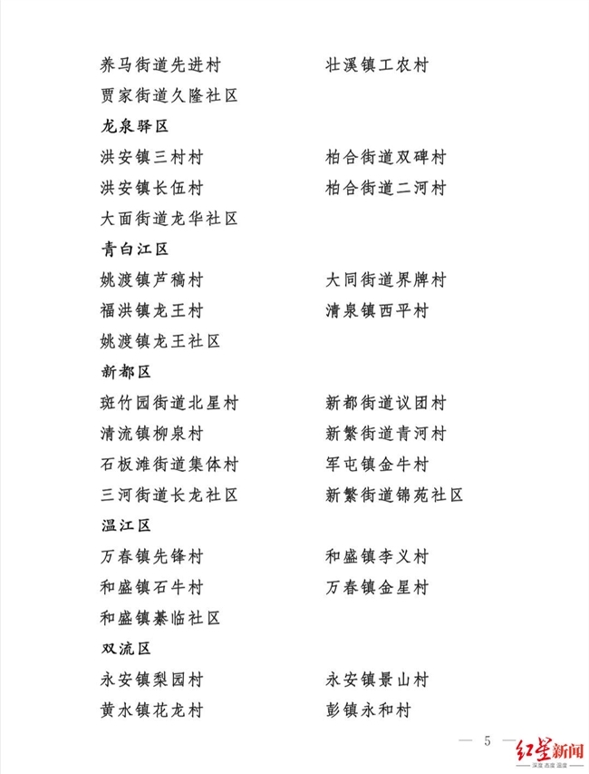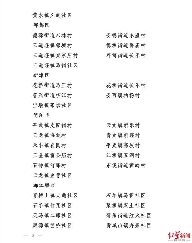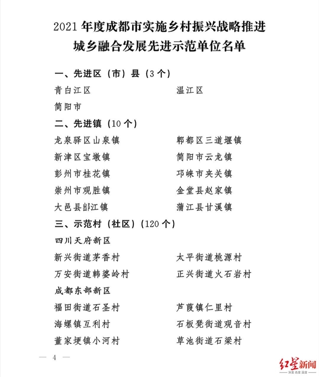 红星新闻记者从会上获悉,青白江区、温江区、简阳市3个区(市)被命名为“2021年度成都市实施乡村振兴战略推进城乡融合发展先进区(市)县”;大邑县出阝江镇等10 个镇被命名为“2021年度成都市实施乡村振兴战略推进城乡融合发展先进镇”;四川天府新区太平街道桃源村等120个村(社区)为“2021年度成都市实施乡村振兴战略推进城乡融合发展示范村(社区)。