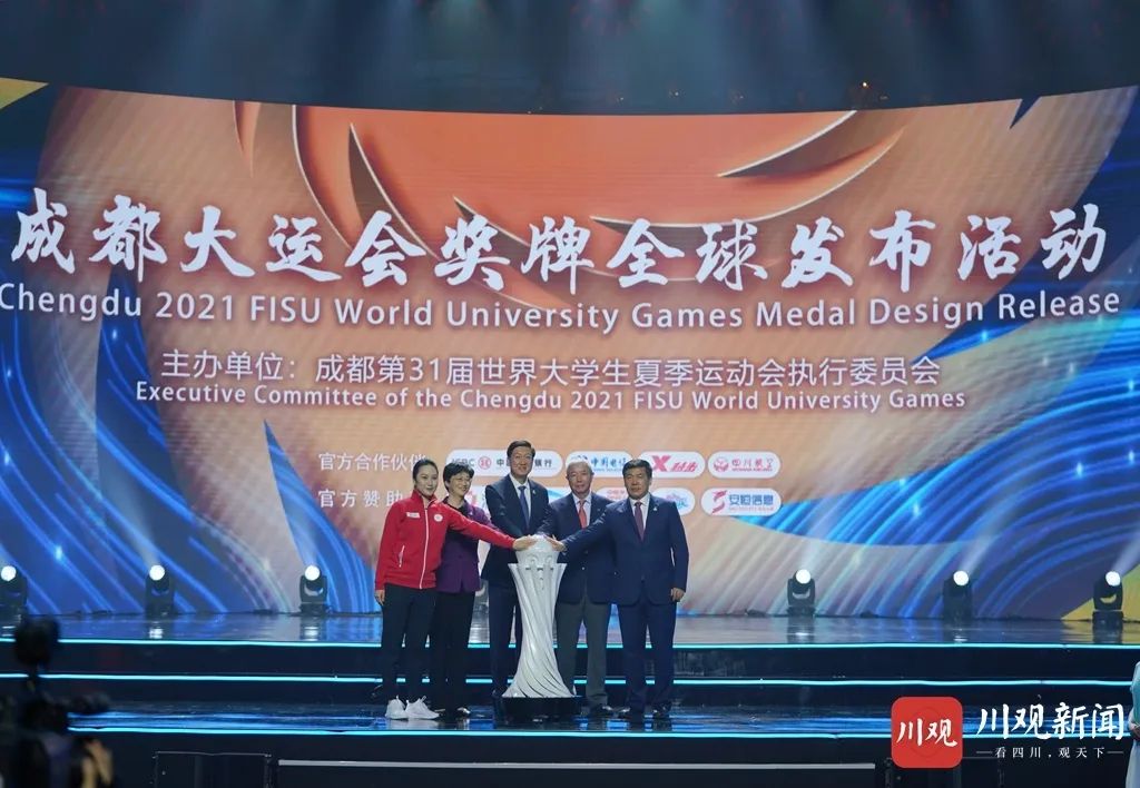 20时40分,大屏幕播放成都大运会奖牌设计专题片《追光》。苟仲文、黄强和奥运会冠军邹敬园、施廷懋一起走上舞台,共同启动发布装置,成都大运会奖牌“蓉光”正式亮相。