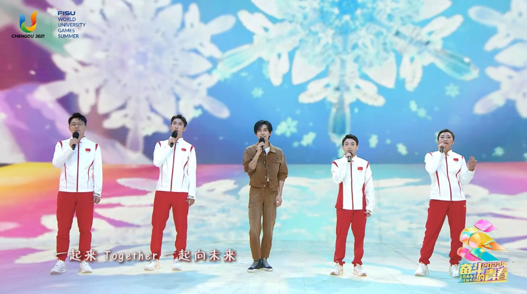 在节目中,施廷懋手举成都大运会火炬“蓉火”,与奖牌“蓉光”、颁奖系列物资以及身着火炬手服装、升旗手服装、礼仪服装的青年大学生同台亮相。