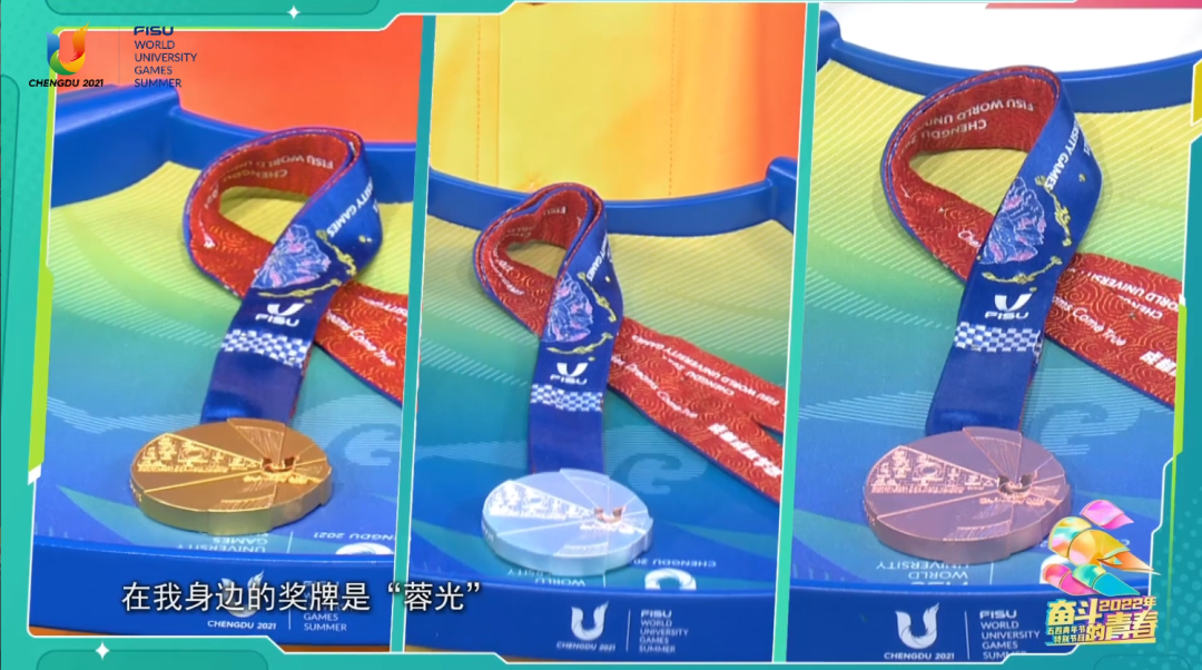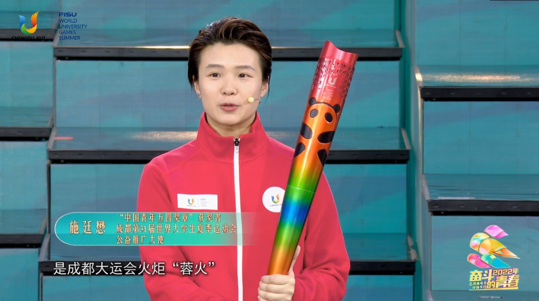 “在我手中的是成都大运会火炬‘蓉火’,寓意着‘融合’与‘包容’,体现了绿色、智慧、活力、共享的办赛理念。在我身边的的是奖牌‘蓉光’,寓有‘荣光’之意。成都成就梦想,我们一起努力为世界呈现一届具有中国特色、时代气息、青春风采的国际体育盛会。”施廷懋在节目中说到。
